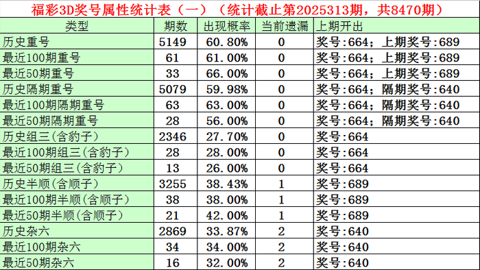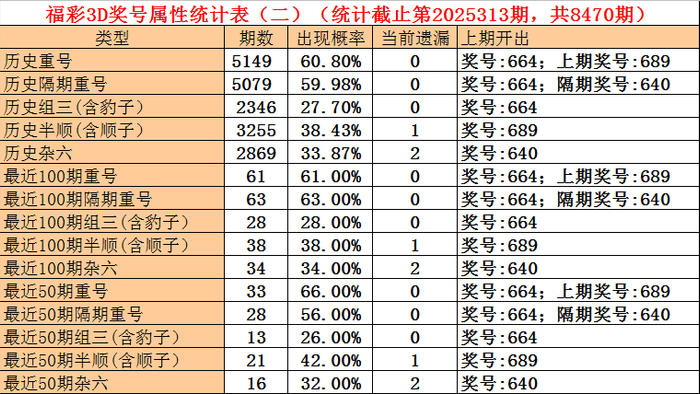 福彩3D第2025311期奖号为640,第2025313期奖号为664,隔期奖号出号664。从统计表中分析,最近100期隔期奖号出现63期,出现比例为63%,最近50期隔期奖号出现28期,出现比例为56%,最近10期隔期奖号出现 8期,出现比例为80%,本期防止隔期号中号码轮空。