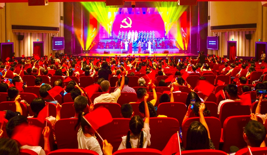 音乐会尾声,《没有共产党就没有新中国》的旋律响彻全场。《我和我的祖国》深情的歌声汇成洪流,充盈着剧院的每个角落。