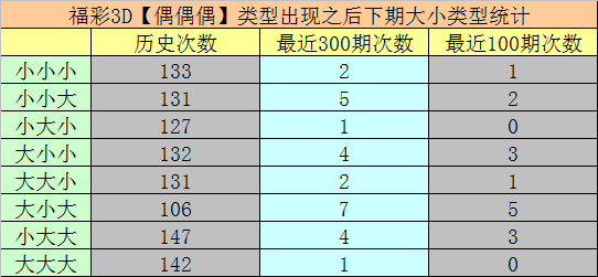 二、最近7次【大大小】奖号之后,其下期分别开出号码:457、626、914、055、411、844、117,其中组三号码出现5次,组六号码出现2次。本期预计开出组六号码。