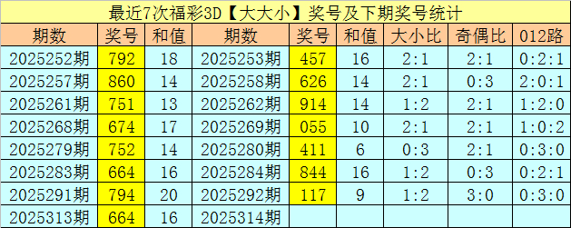开奖回顾:福彩3D第2025313期奖号为664。奖号为:组三,大小比为2:1,大小类型为:大大小。